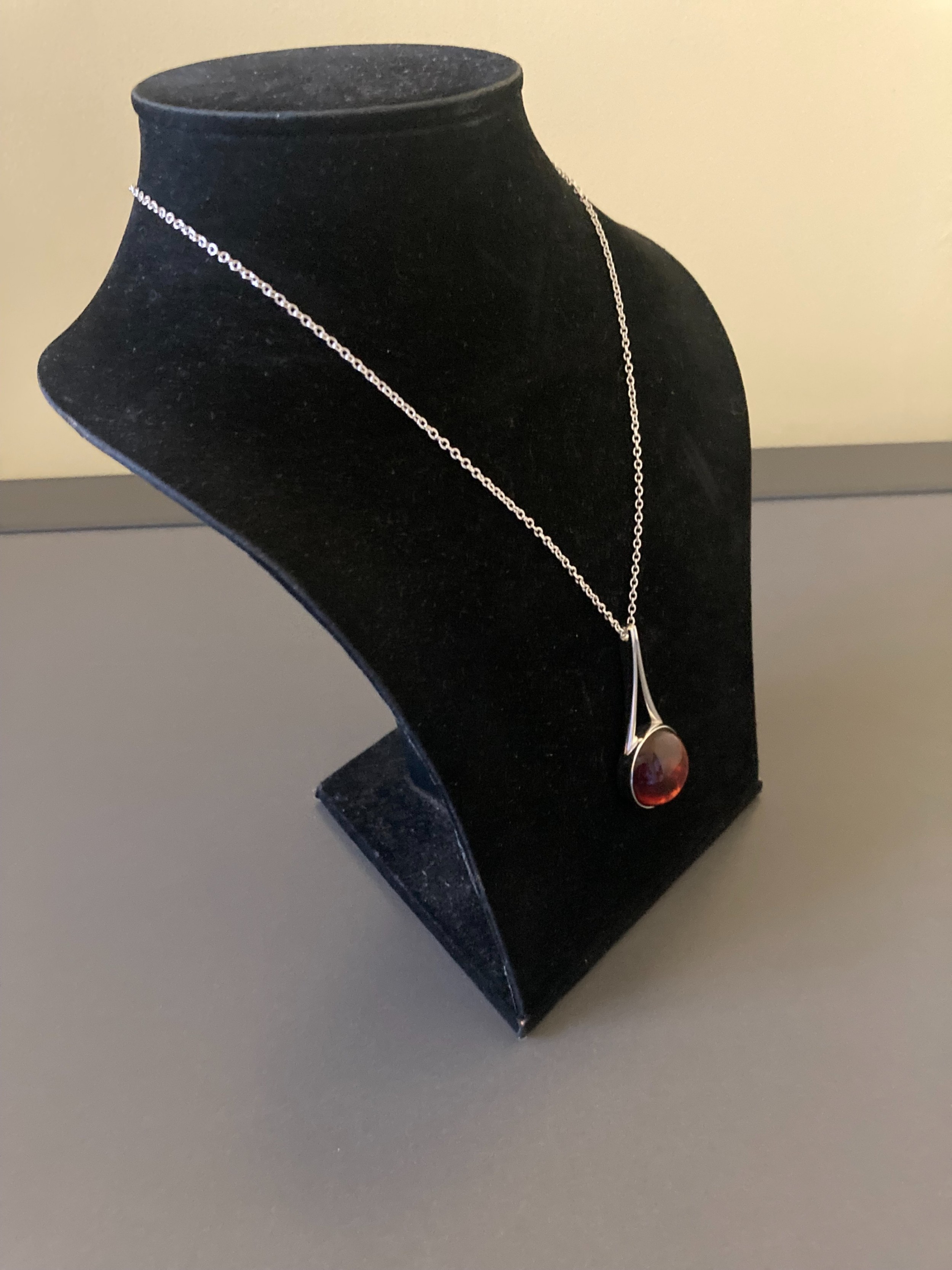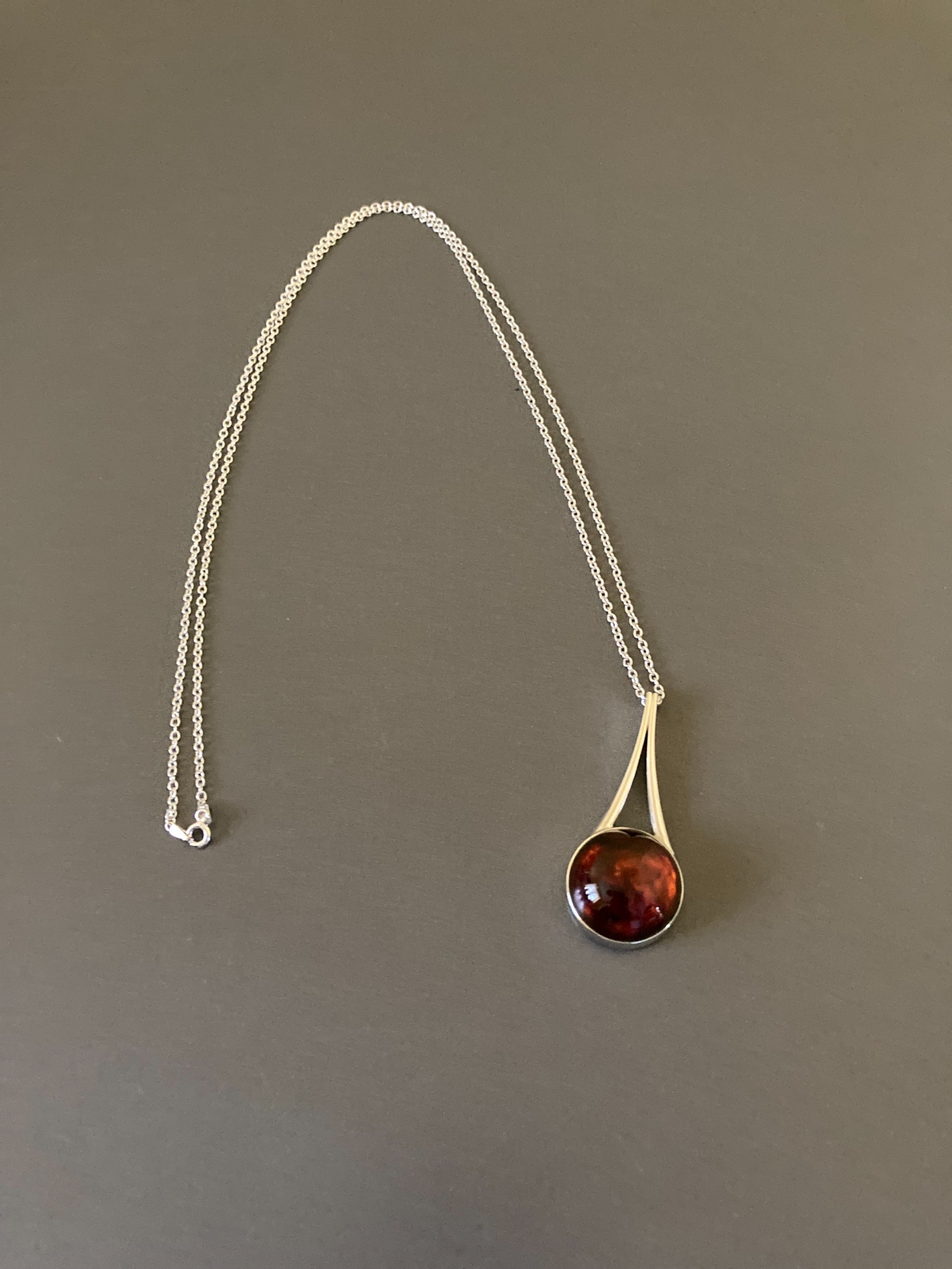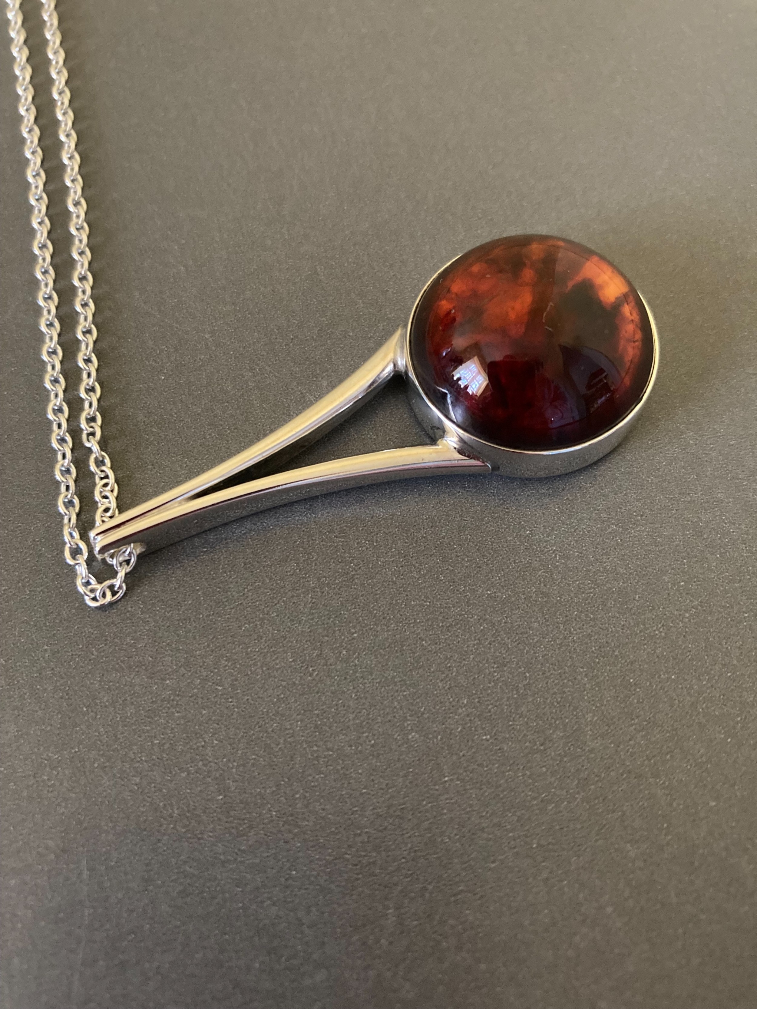 This lovely pendant measures 5.3cm long. The cabochon amber is 2.2cm diameter. The silver chain by another maker is 76cm long. Total weight 16.3g.Excellent condition. Any irregularities in the photos, are light reflections from the camera.