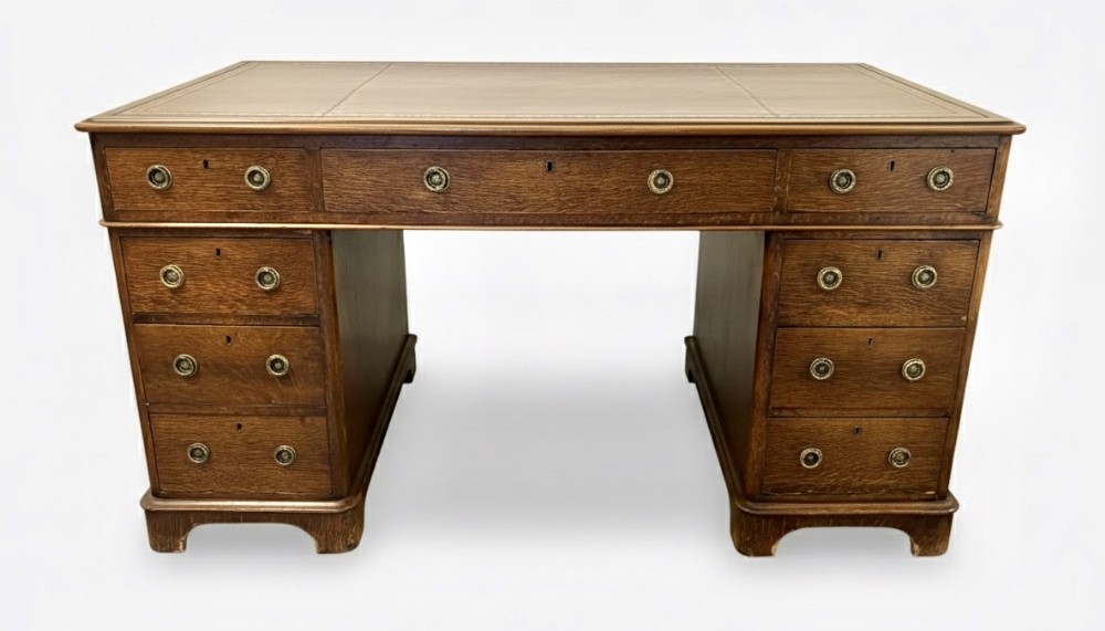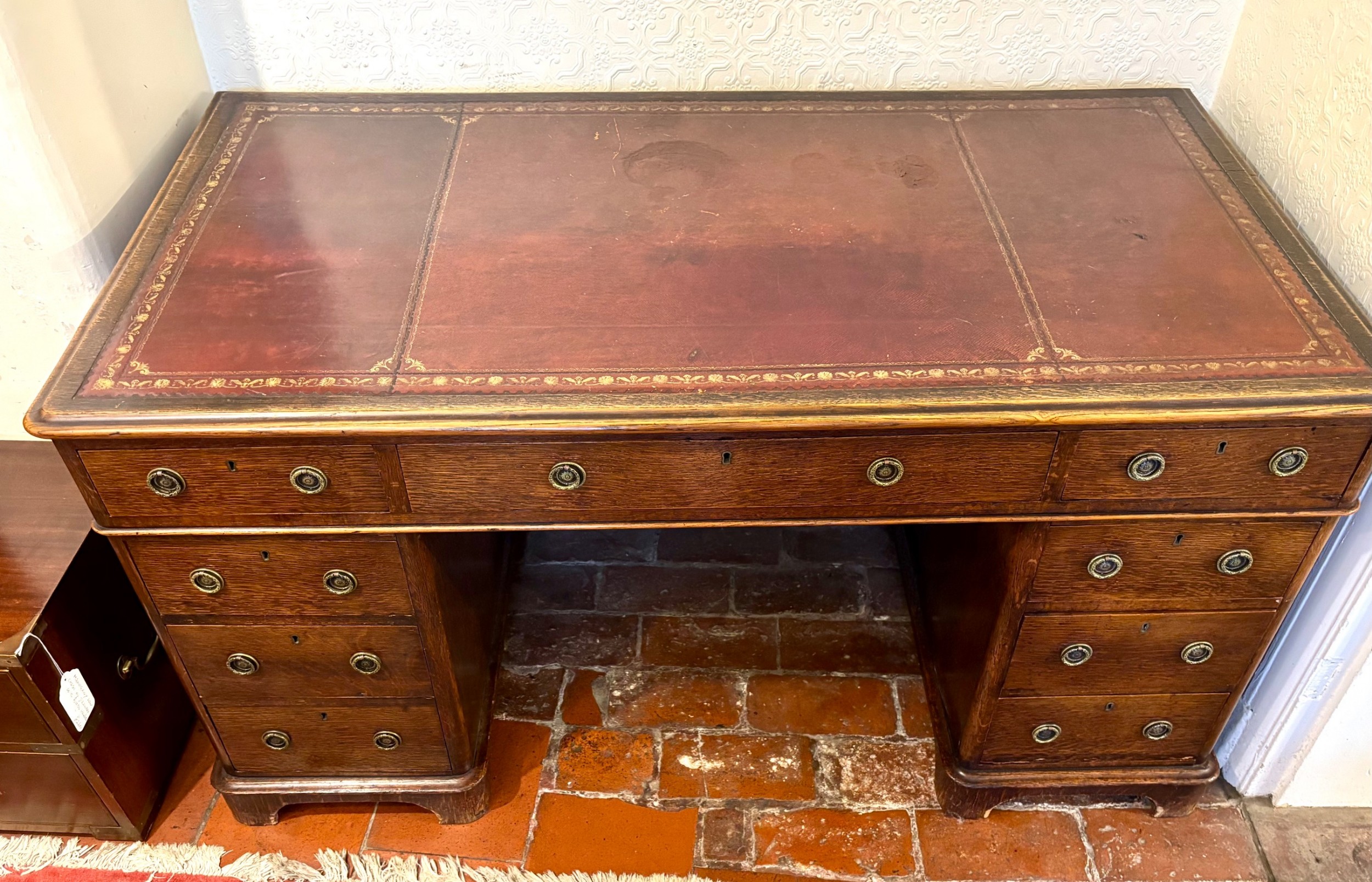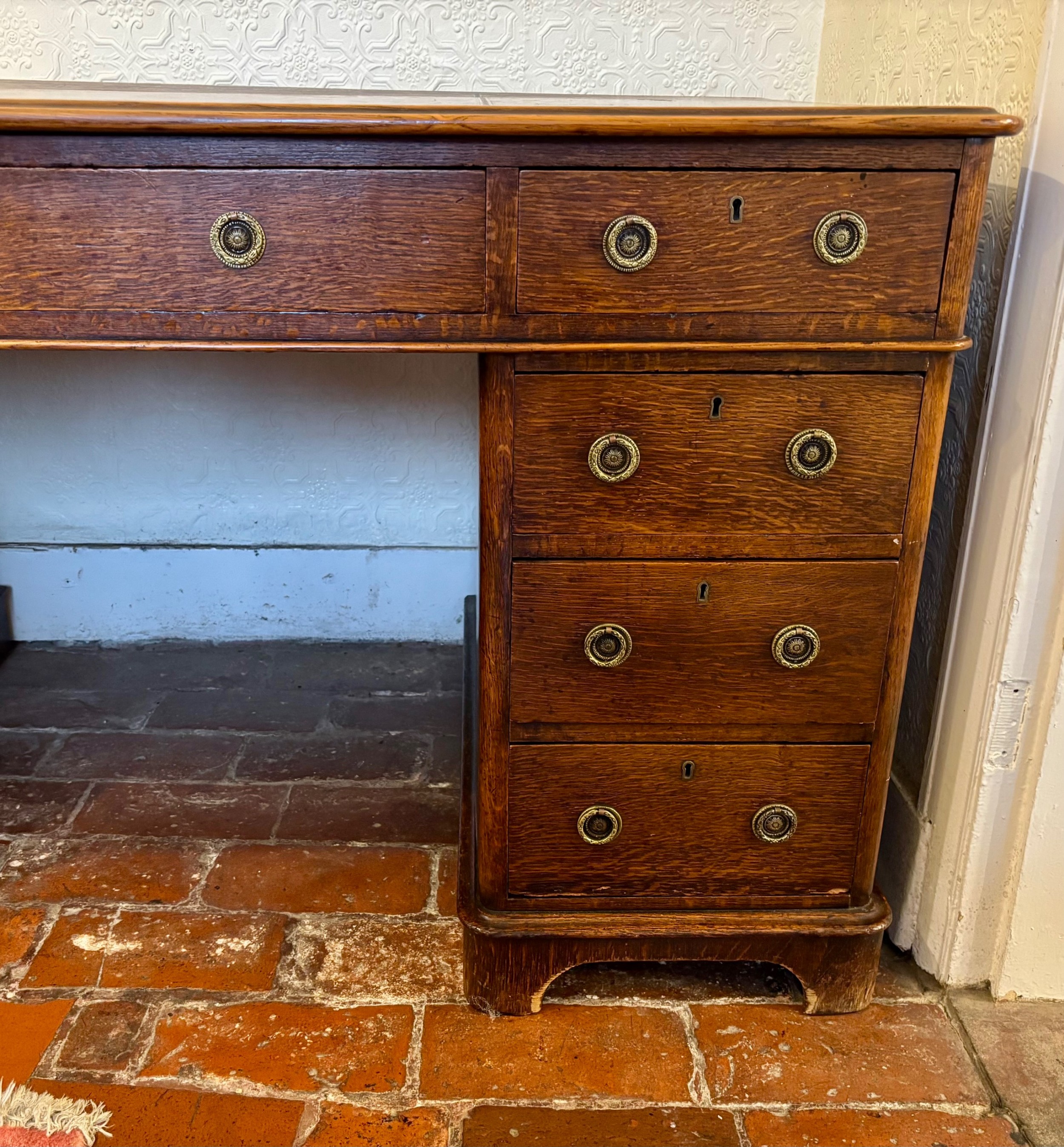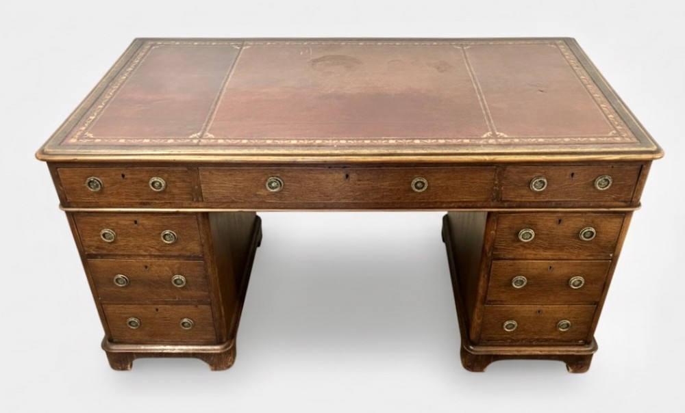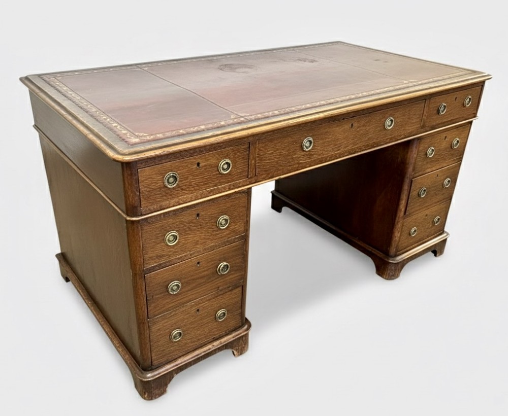 A good sized Victorian oak pedestal desk, with a gilt tooled burgundy leather top. The deep mahogany lined drawers have brass ring handles. The desk is on a plinth base with bracket feet, and the back is polished. It is in the customary three sections, and there is a good wide and high kneehole for the knees.