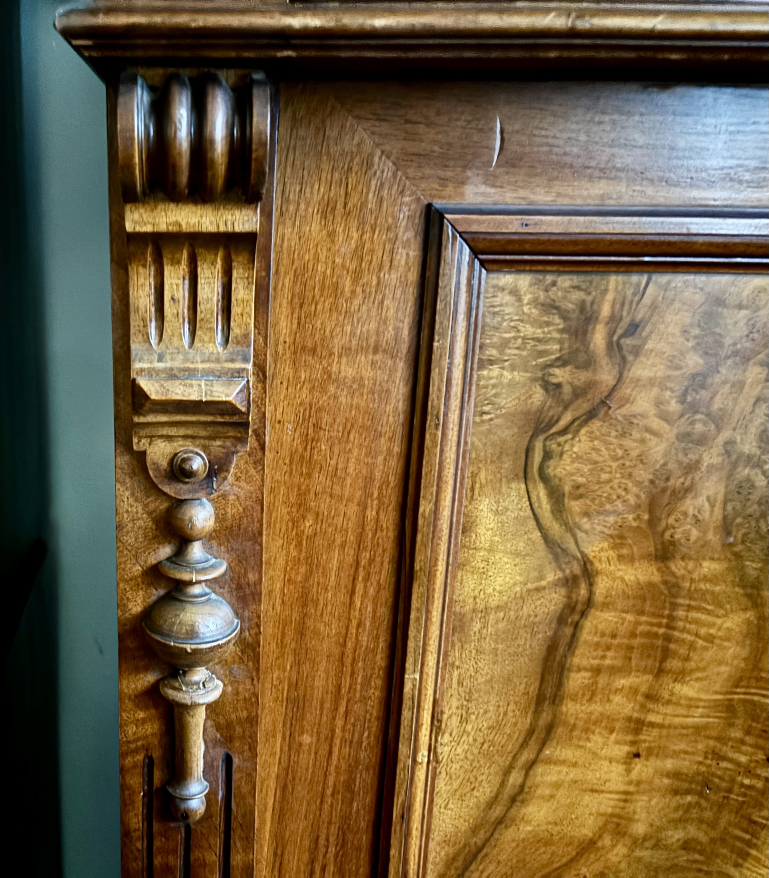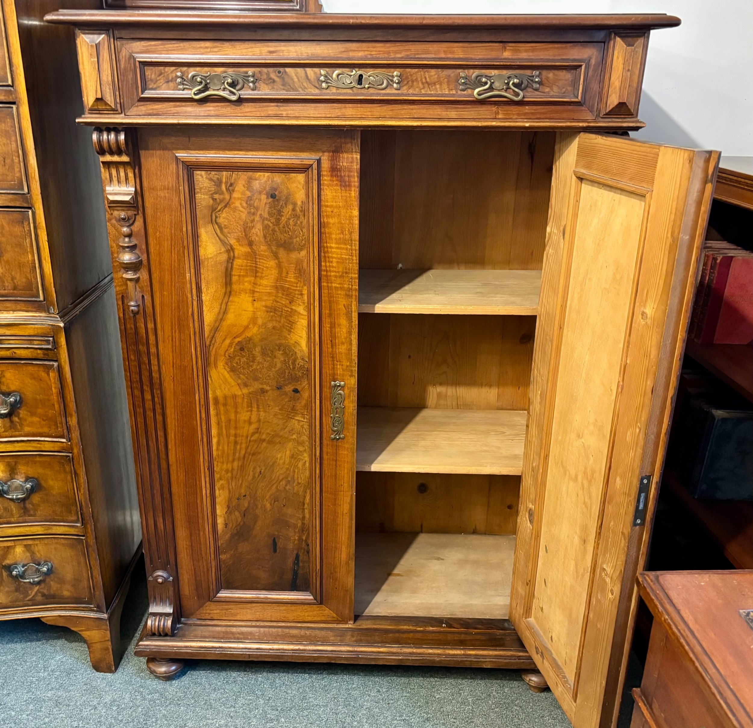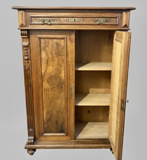 A richly figured walnut side cabinet, the panelled doors enclosing two shelves, and with a long drawer above , with brass handles. The sides are decorated with carved corbels. There are turned feet to the base.