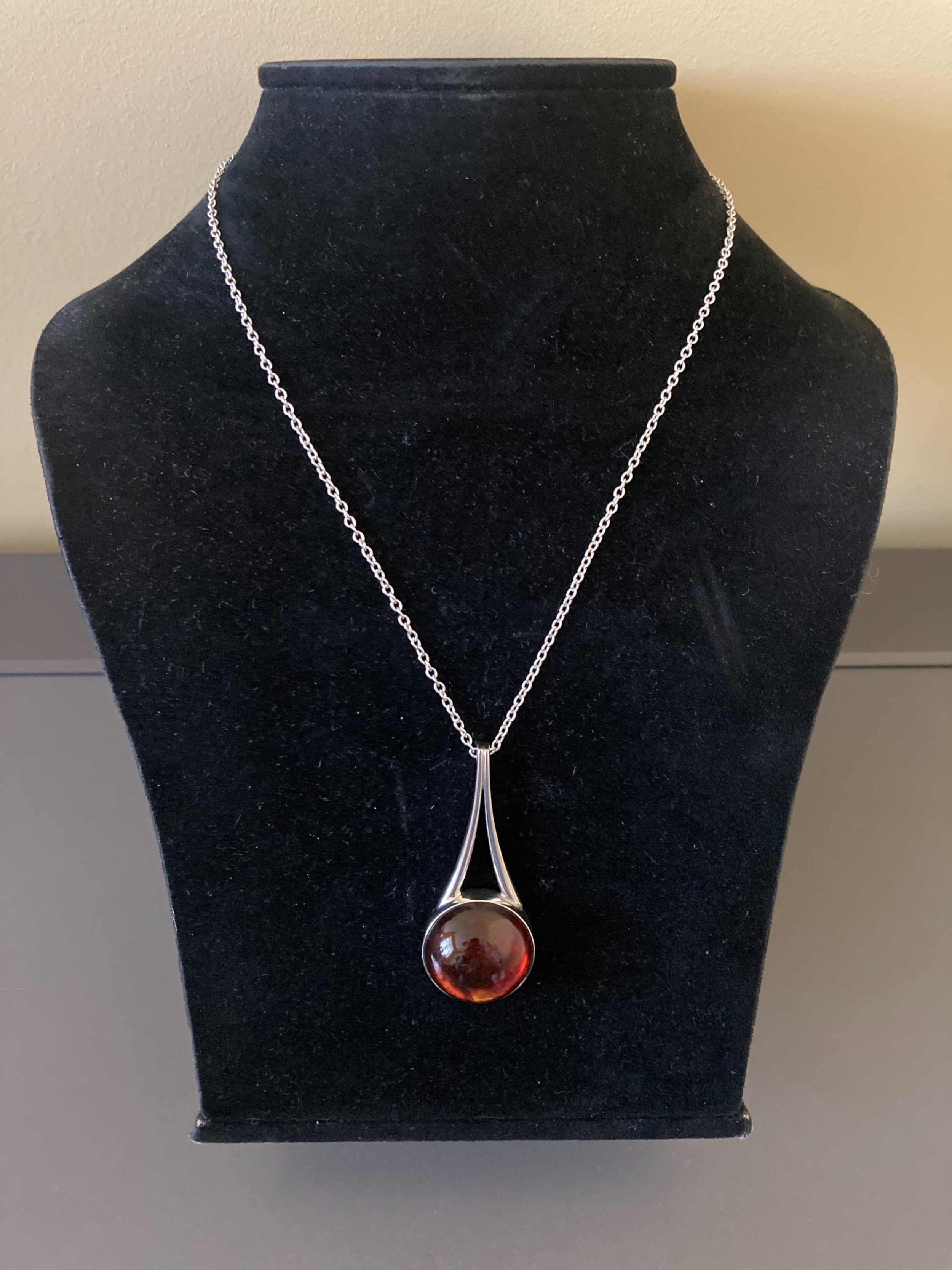 This lovely pendant measures 5.3cm long. The cabochon amber is 2.2cm diameter. The silver chain by another maker is 76cm long. Total weight 16.3g.Excellent condition. Any irregularities in the photos, are light reflections from the camera.