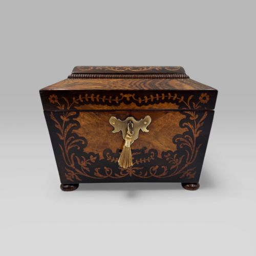 A FINE QUALITY EARLY C19TH REGENCY PERIOD ROSEWOOD AND PARQUETRY TUNBRIDGE WARE SPECIMEN WOOD INLAID TOP CASKET OR BOX CONTAINING A COLLECTION OF EXOTIC SEASHELLS