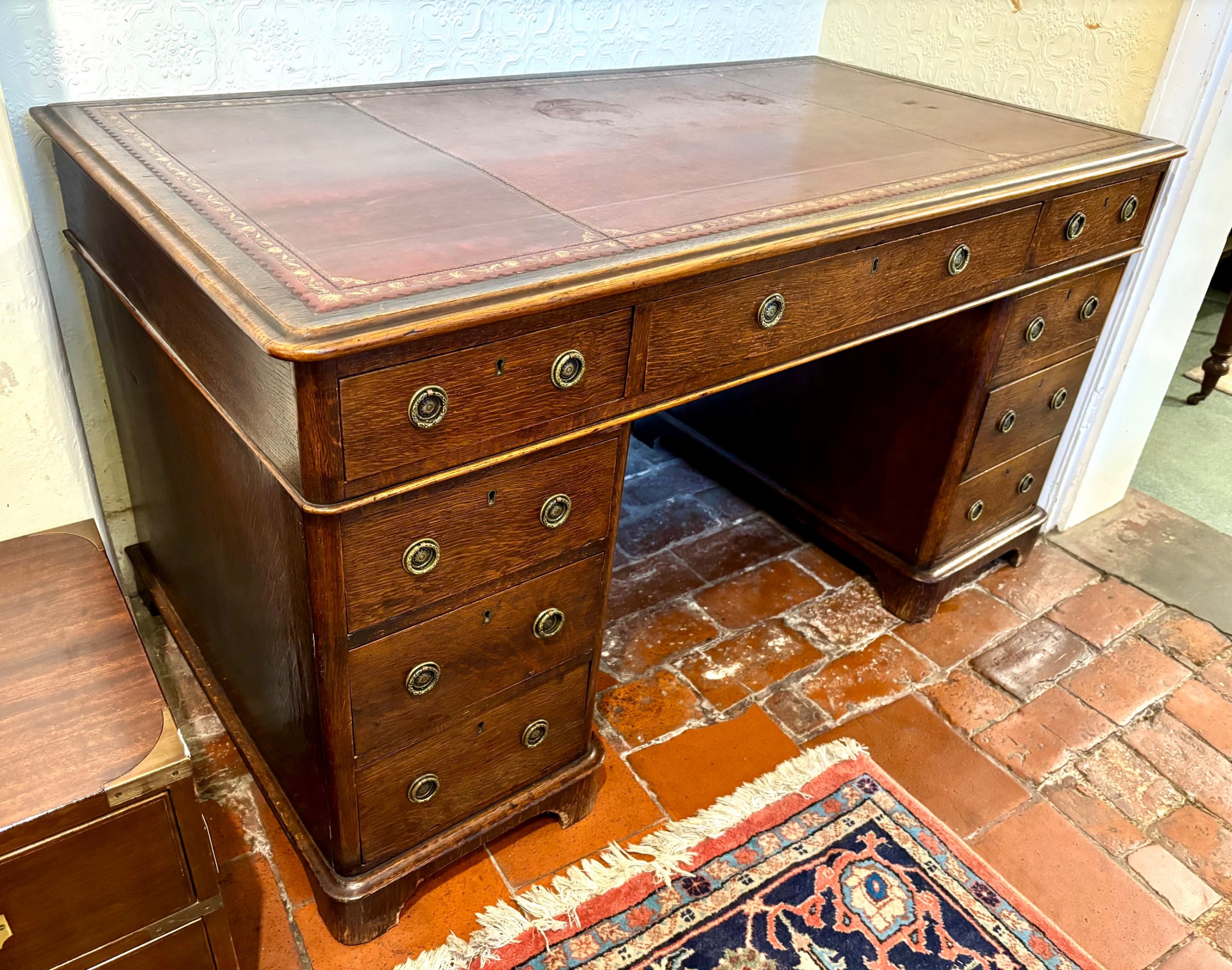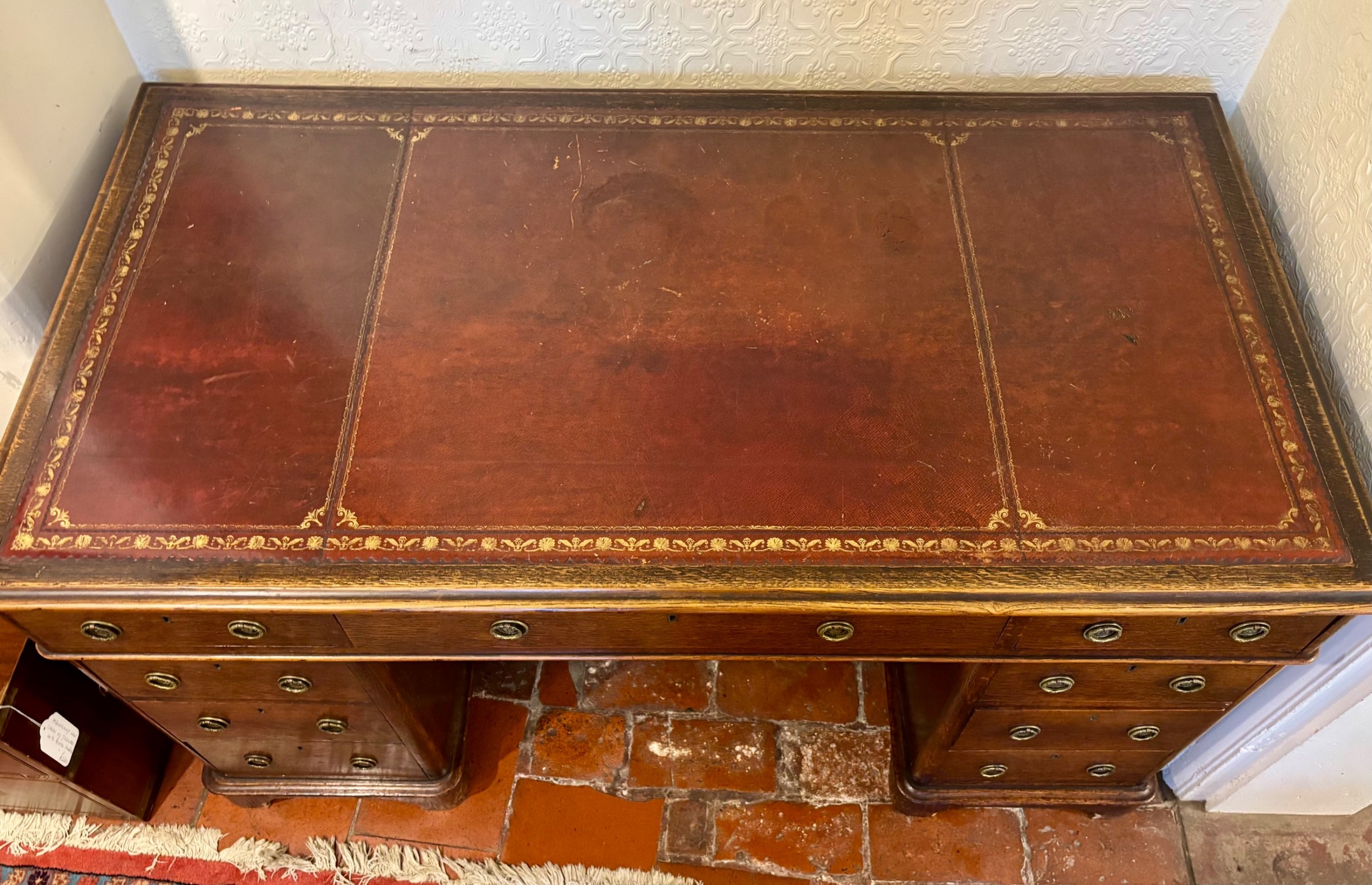 A good sized Victorian oak pedestal desk, with a gilt tooled burgundy leather top. The deep mahogany lined drawers have brass ring handles. The desk is on a plinth base with bracket feet, and the back is polished. It is in the customary three sections, and there is a good wide and high kneehole for the knees.