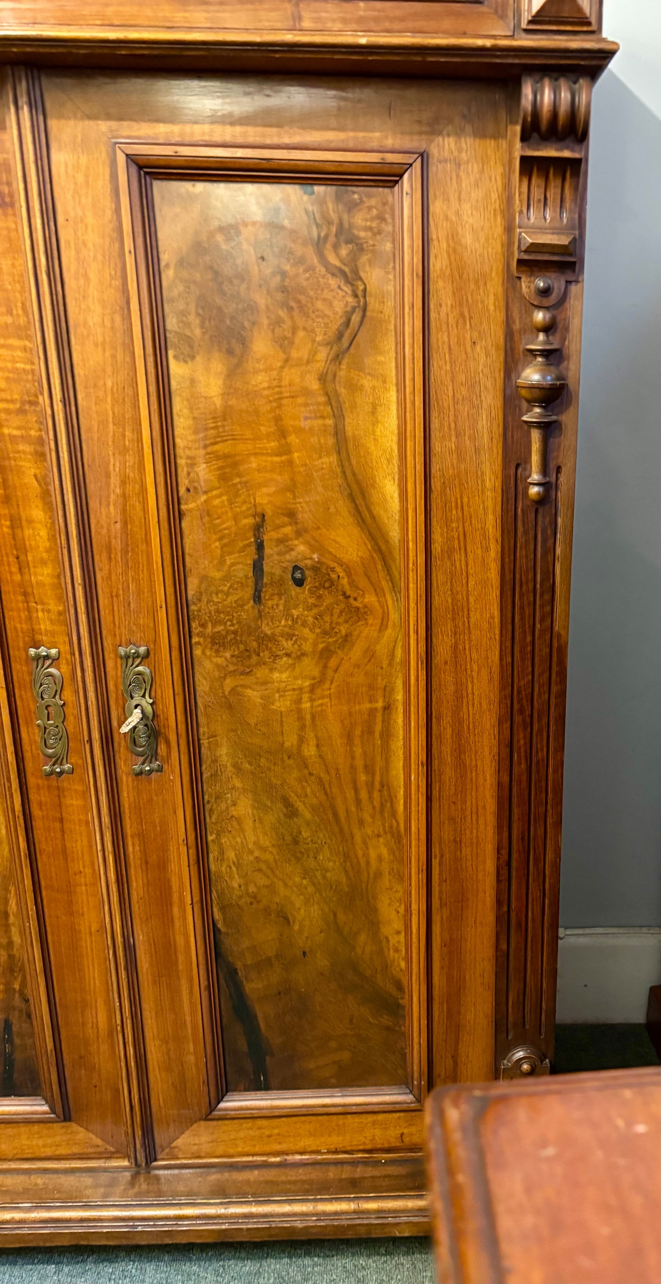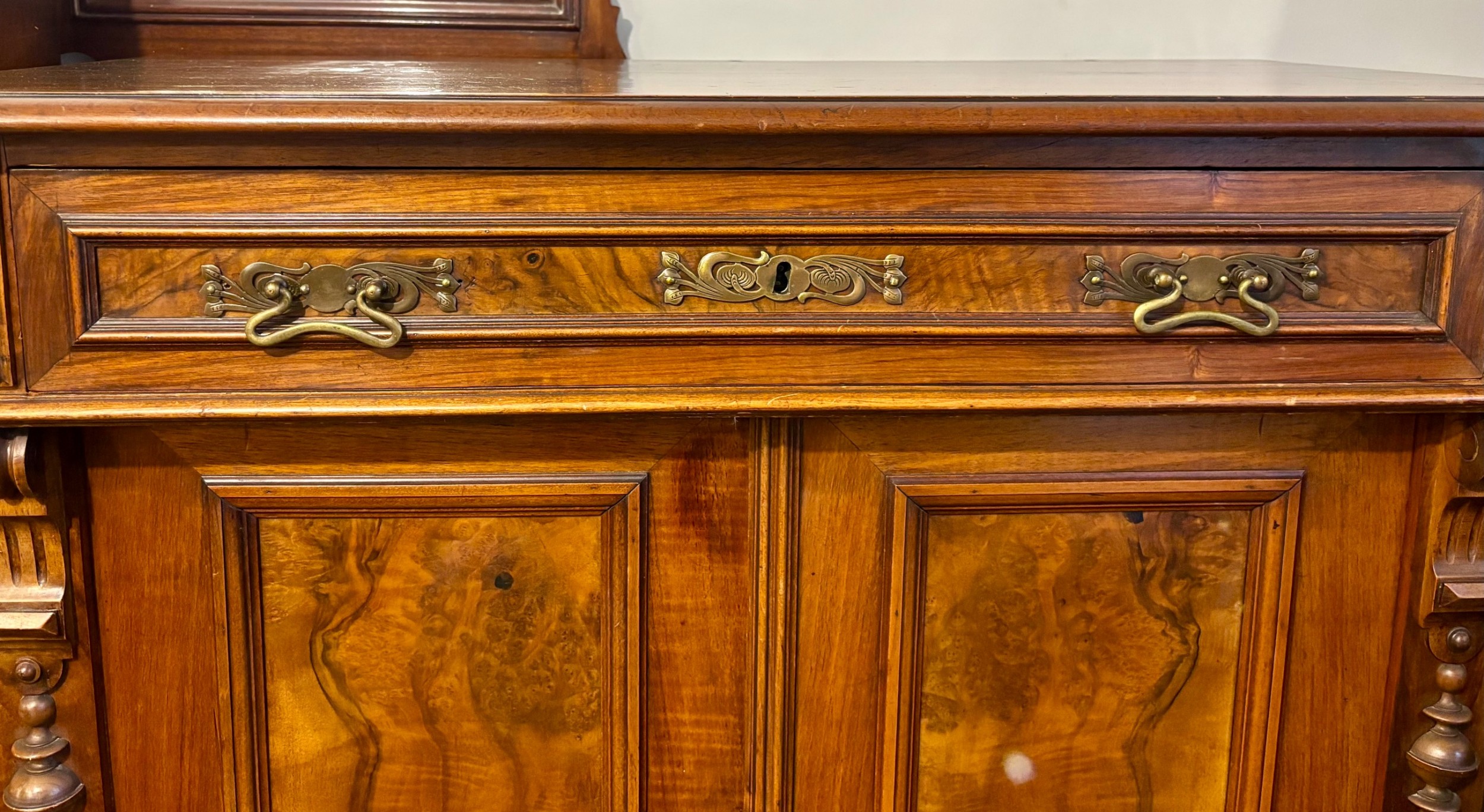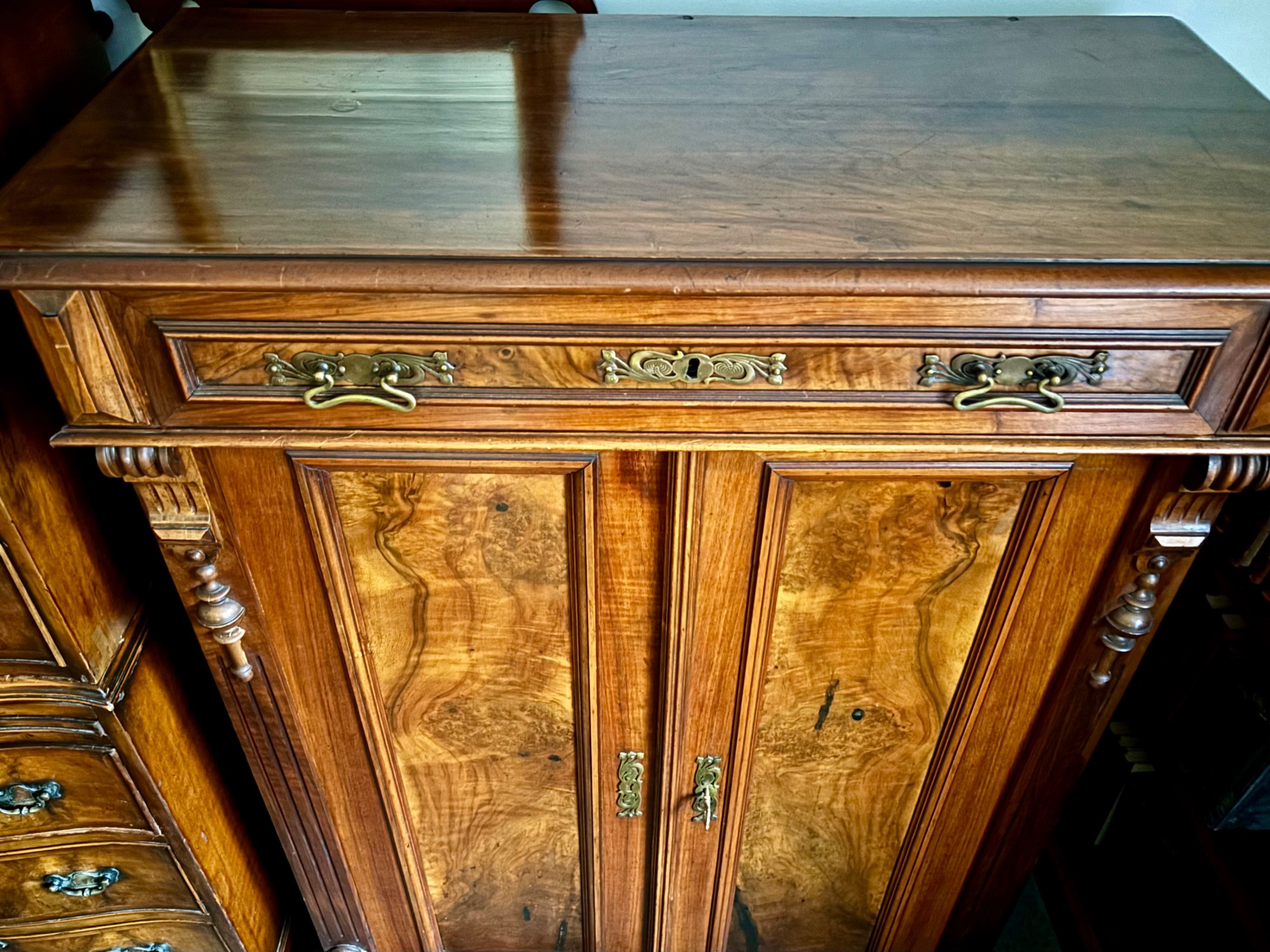 A richly figured walnut side cabinet, the panelled doors enclosing two shelves, and with a long drawer above , with brass handles. The sides are decorated with carved corbels. There are turned feet to the base.